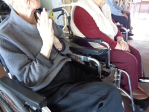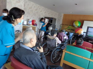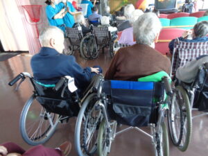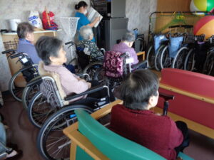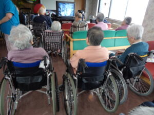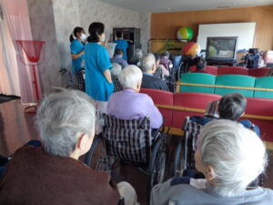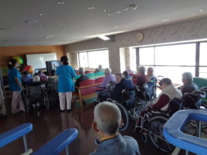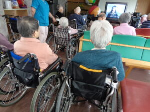2月 カラオケ大会 2026年2月18日 他の曲では景色を眺めるなど落ち着きのなかった方が、美空ひばりさんの「川の流れのように」が流れると、動きを止めて音を聞き歌っています。終わってからの感想は「楽しかった、こんなのは久しぶりだった。」と話してくれました。マイクがなくても歌が流れてくれば、自然に口ずさんでしまうものなんですね。次回もまた一緒に歌いものです。